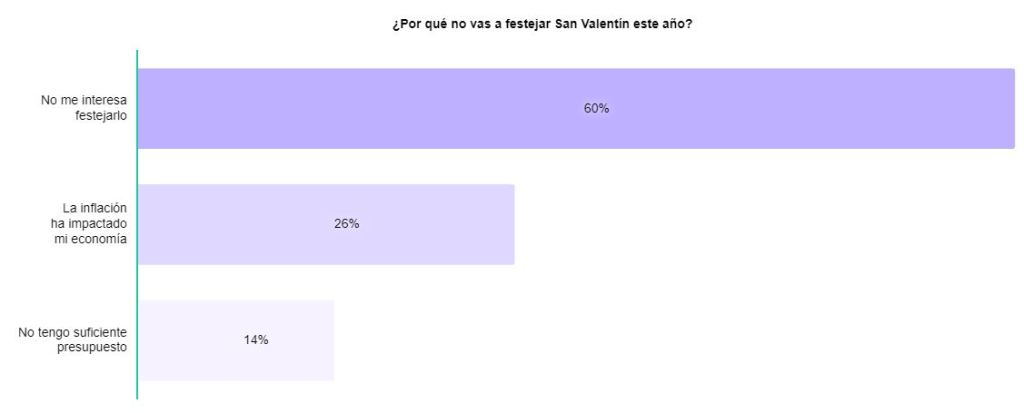 La encuesta muestra que el 40 por ciento de los mexicanos que sí va a celebrar San Valentín presupuesta menos de 500 pesos. Asimismo, el 76 por ciento de los mexicanos que sí festejará no será mayor a 1,000 pesos, ya que el 40 por ciento declaró que su presupuesto será menor a 500 pesos para las actividades y/o regalos de esta fecha; 36 por ciento declaró que su presupuesto será de 500 a 1,000 pesos, y el 10 por ciento y 14 por ciento restante declararon tener presupuestos mayores a 1,000 y 2,000 pesos, respectivamente.