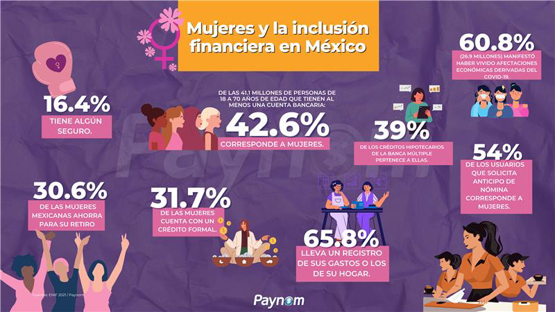 En México para atender la insuficiencia de ingresos, una mayor cantidad de personas, incluidas las mujeres, prefiere medios como el empeño o vender bienes (20%), así como el adelanto salarial (19%). Una encuesta aplicada a usuarios de la plataforma de bienestar laboral Paynom indica que el 54% de los usuarios que solicita anticipo de nómina o adelanto de nómina corresponde a mujeres y el 46% a hombres; 55% solicita dos veces al mes el anticipo de nómina, 37% una vez al mes, 5% tres veces al mes y 3% más de cuatro veces al mes; 70% accede al anticipo de nómina vía app y 30% desde la web; 24% usa el anticipo de nómina para pagar servicios, 18% para liquidar deudas y gastar en comida; 6% para emergencias médicas y 2% para pago de colegiaturas.