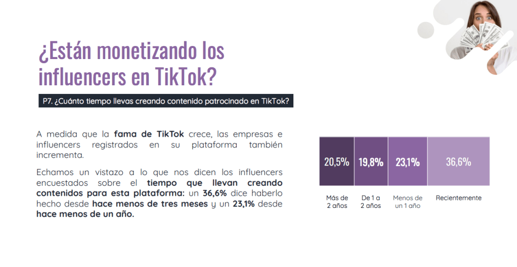Fuente de monetización: 28 por ciento de los encuestados monetiza lo suficiente como para que sea un ingreso extra, con ocho por ciento que podría vivir exclusivamente de los ingresos que genera en TikTok. Todavía la mayoría está buscando una forma de monetizar en esta red social.