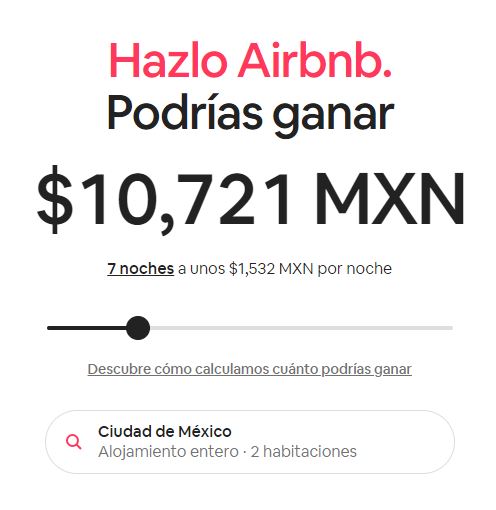 Para conocer un estimado de cuánto puedes obtener al compartir tu espacio, visita Airbnb.mx/Host.