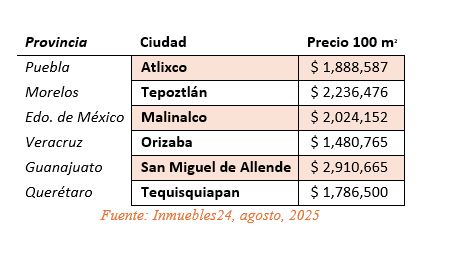 Cabe señalar que los precios que se presentan están basados en los anuncios registrados en la plataforma Inmuebles24 al mes de agosto de 2025. Se tomaron como ejemplo estándar viviendas de 100 metros cuadrados.