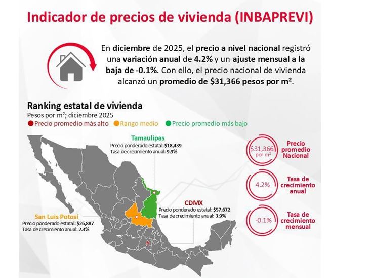 En diciembre de 2025, el precio nacional de vivienda alcanzó un promedio de 31 mil 366 pesos por metro cuadrado, lo que representó una ligera disminución mensual de 0.1%. No obstante, la variación anual se situó en 4.2%.